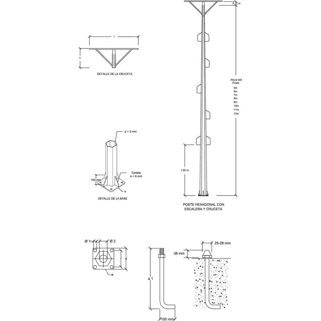Poste de sección hexagonal y tronco piramidal con 12,7 mm/m de conicidad fabricado con láminas de acero ASTM A-36 de 3 mm de espesor cortado y doblado en frío en tramos estándares unidos transversalmente a la longitud del poste mediante refuerzos internos. Fijado a una base cuadrada de acero con agujeros para los pernos de anclaje y el cableado y que sirve de asiento para su fijación en un pedestal de concreto por medio de las tuercas. El poste tiene en la parte inferior un refuerzo de cuatro cartelas de forma triangular soldadas a éste y a la base cuadrada de acero como se muestra en la figura detalle de la base y cartela. Las escaleras están construidas con bases estriadas de acero ASTM 1010 de 1/2" de diámetro colocadas a partir de 1,60 m, con 54 cm de contrahuella. Al poste hexagonal se le aplica un fondo anticorrosivo de cromato de zinc. Las dimensiones del poste, la base y los pernos se especifican en las figuras y tabla contigua. Los postes se fabrican de acuerdo a la norma venezolana COVENIN 323:1997. Crucetas: para montar en el tope del poste hexagonal deportivo, se fabrica en acero ASTM A-36 cortado y estampado al frío, el extremo consta de una base de lámina de 3 mm reforzada por ángulos como muestra la figura de detalle de cruceta. Las dimensiones de la cruceta se muestran en la tabla de dimensiones de cruceta. Se le aplica un fondo anticorrosivo de cromato de zinc.
